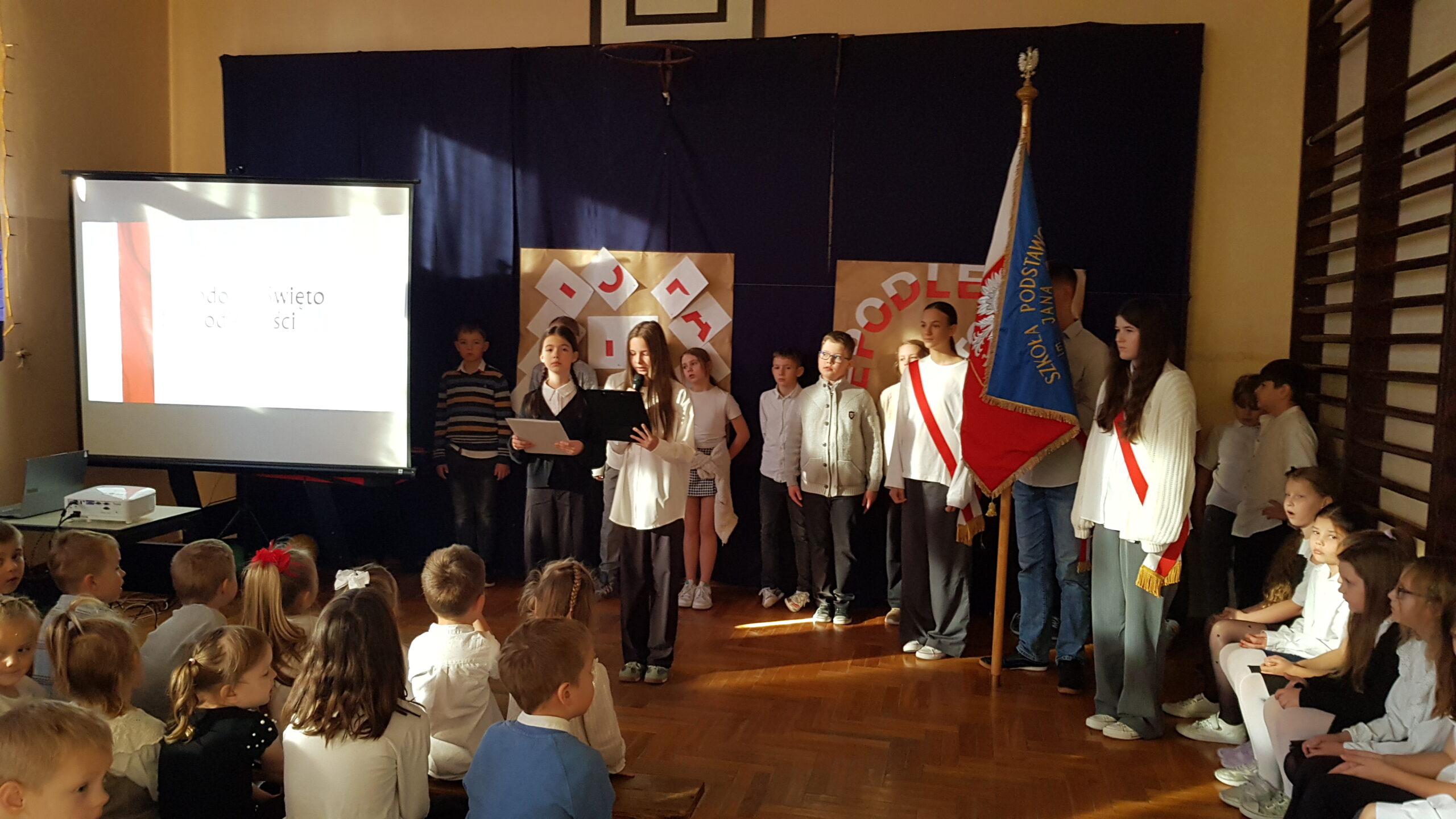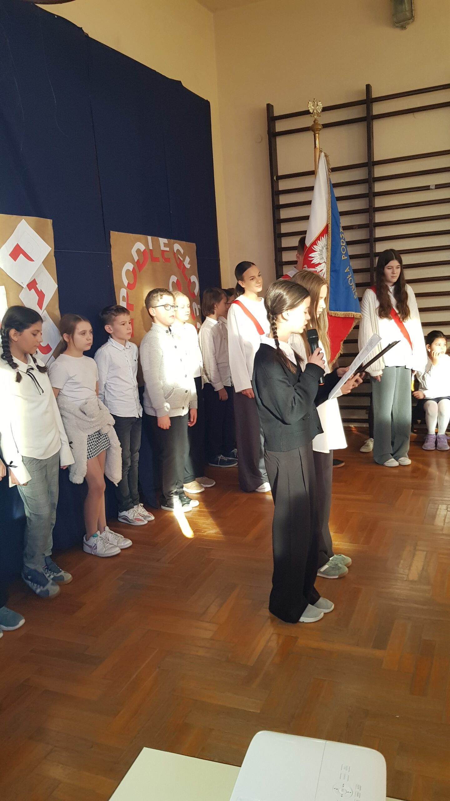 W piątek, 7 listopada, w naszej szkole odbył się uroczysty apel z okazji Narodowego Święta Niepodległości. Wydarzenie rozpoczęło się od przemówienia uczennic klasy V, które przypomniały wszystkim o znaczeniu tego wyjątkowego dnia w historii Polski. Ich słowa były pełne dumy i refleksji nad wartością wolności oraz patriotyzmu.