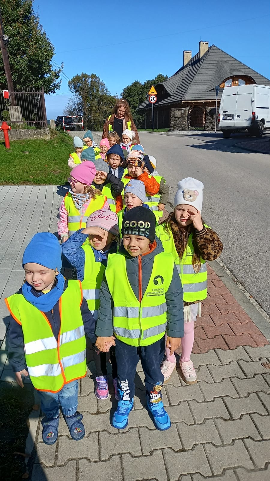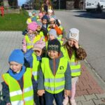 W czwartkowe, słoneczne przedpołudnie dzieciaki wybrały się na niezwykły spacer w kamizelkach odblaskowych. Na początku odbyliśmy pogadankę na temat tego, czym jest kamizelka odblaskowa, jak ona wygląda i jakie znaczenie ma jej noszenie. Następnie udaliśmy się na spacer, podczas którego dzieci przypomniały sobie zasady poruszania się po drogach, chodnikach i przejściach dla pieszych.