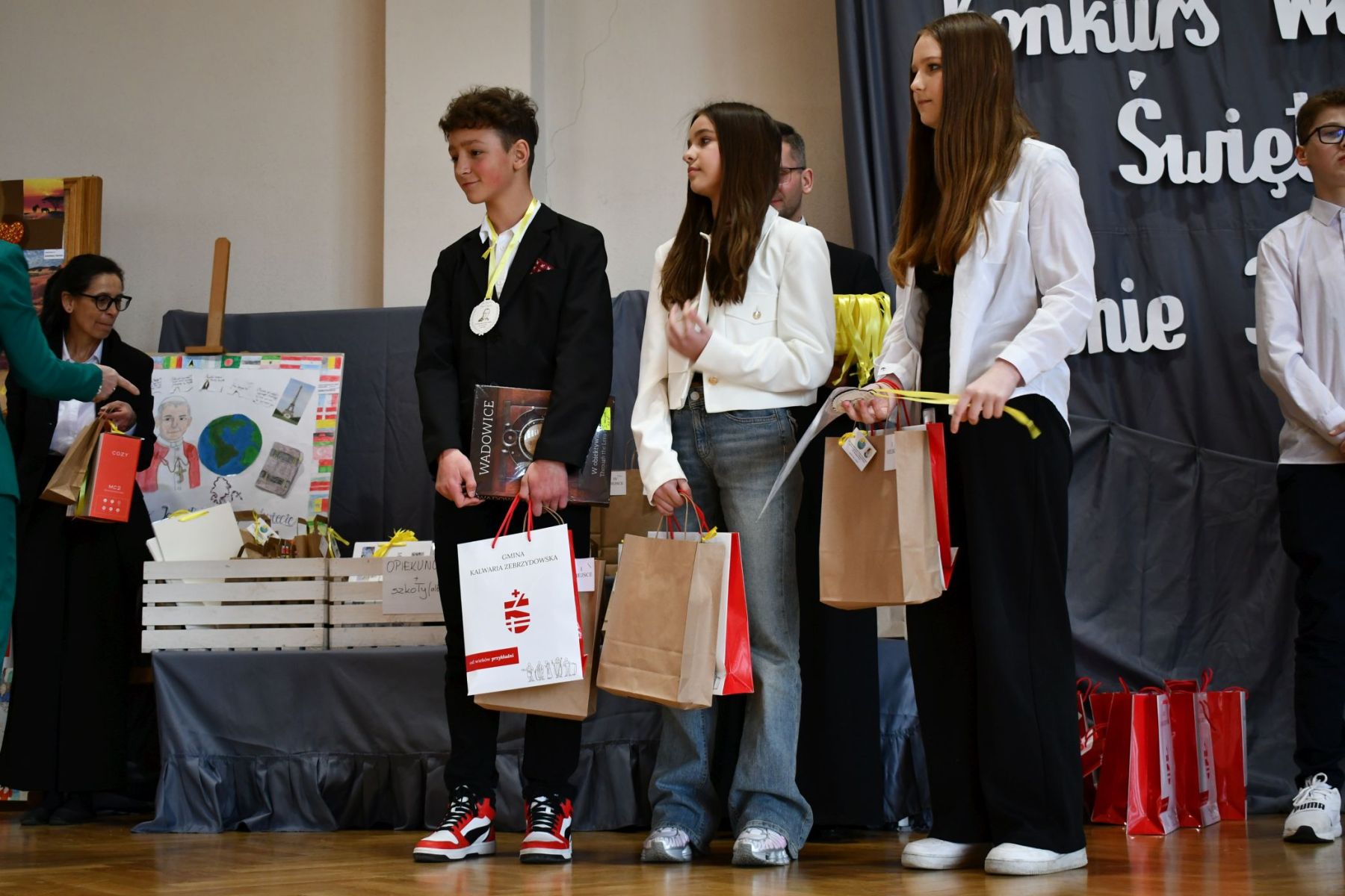 Zwycięzcy oraz pozostali uczestnicy konkursu otrzymali nagrody i upominki, słodycze ufundowane przez Urząd Miasta w Kalwarii Zebrzydowskiej oraz materiały drukowane, pakiety promocyjne, gadżety przekazane przez:  Urząd Miasta w Kalwarii Zebrzydowskiej.  Urząd Miejski w Wadowicach Wydział Promocji Gminy i Referat Obsługi Ruchu Turystycznego. Statuetki  i medale ufundowała Rada Rodziców ze Szkoły Podstawowej nr 1  im. Jana Pawła II w Stanisławiu Dolnym.