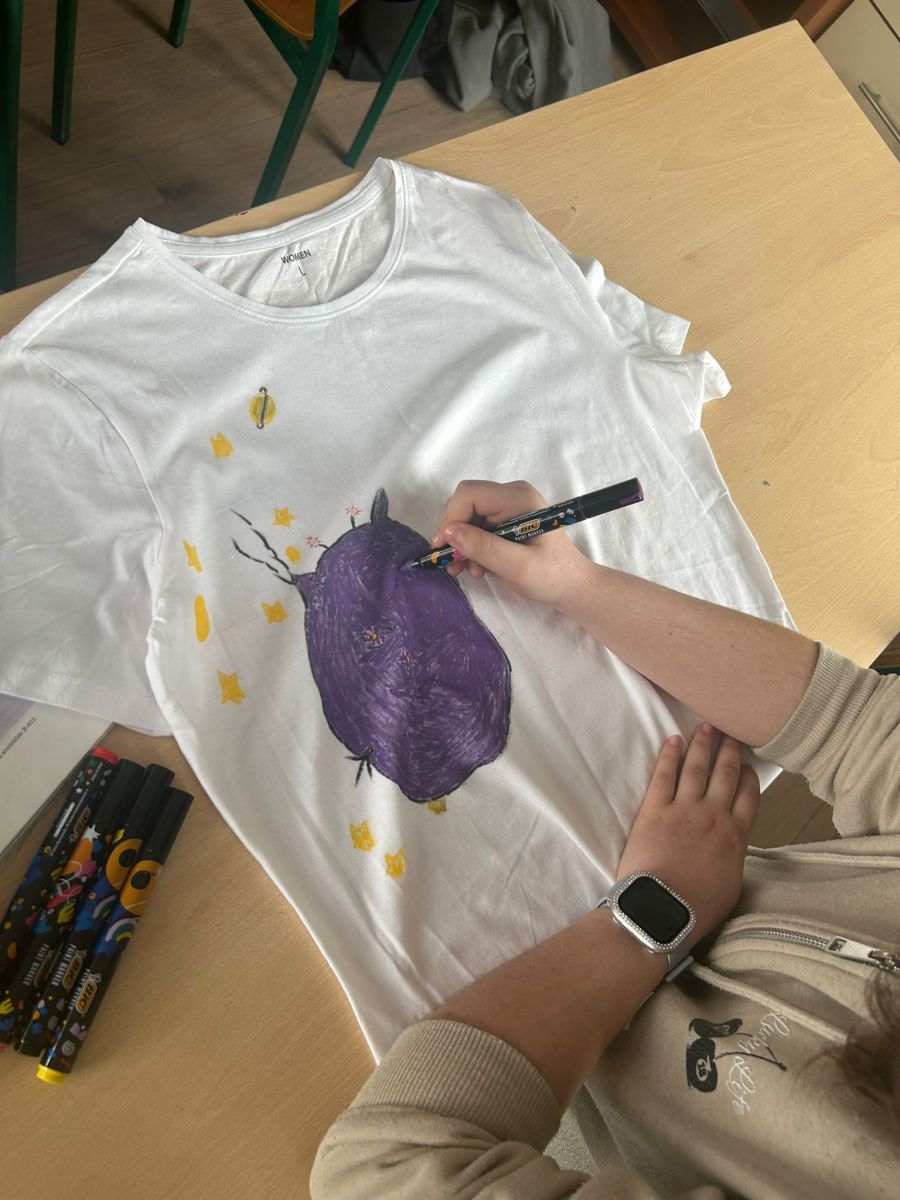 Jak wszyscy pamiętamy, jest to niezwykle wzruszająca opowieść o małym i samotnym chłopcu, który opuszczając swoją asteroidę B-612, wyrusza w bardzo ciekawą życiową podróż. Książka ta jest pełna zarówno uczucia, jak i głębokiej mądrości. Stąd też pomysł nauczyciela języka polskiego, by uczniowie wybrali spośród wielu sentencji zamieszczonych w tekście te, które wyjątkowo zwróciły ich uwagę, a następnie zamieścili je na koszulkach. Oczywiście wcześniej przygotowali sobie białe t- shirty, markery i przystąpili do pracy. Na koszulkach, obok napisów, znalazły się też rysunki doskonale kojarzące się z treścią książki.